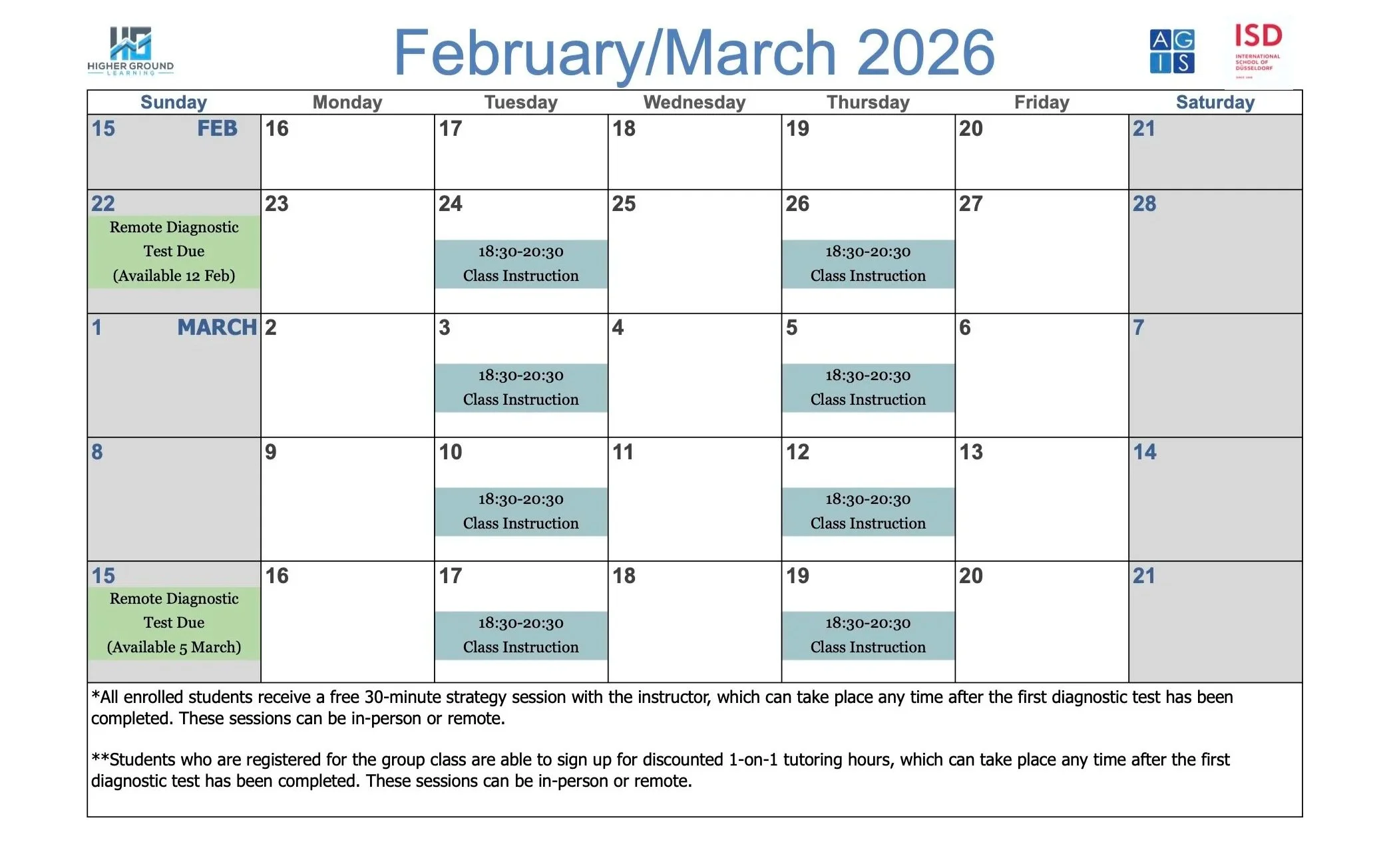 All students have the opportunity to schedule a free 30-minute individual strategy session with a Higher Ground Learning instructor. These sessions are perfect to use to understand their diagnostic score reports, identify strengths and weaknesses, and form an individualized strategy to maximize SAT success.